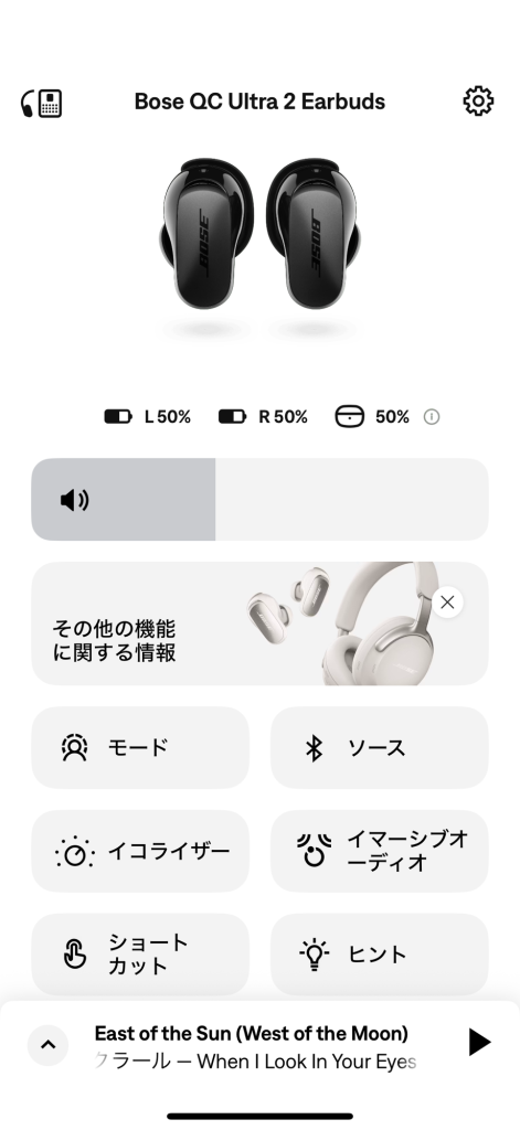 Bose最大のお気に入りのポイントは強力なノイキャンです。電車通勤でも電車内やホームの雑踏でもボリューム調整不要。強さはそのままに第1世代にあったホワイトノイズがほぼなくなった感じ。