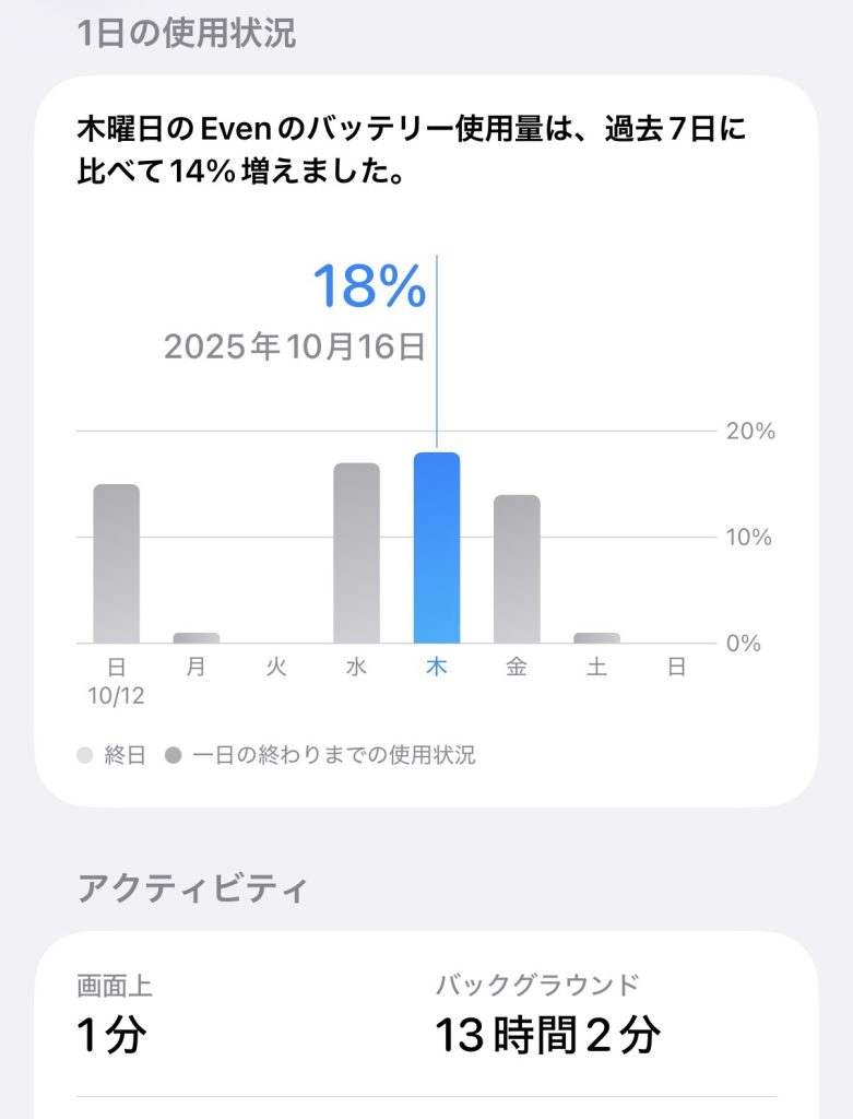 iPhone 16 Proは購入してまだ一年ちょっと。最大容量も96%の水準。通常、帰宅時にはバッテリー40%〜50%は残ってたのに、最近、インジケーターが赤くなり15%まで減る状態に。